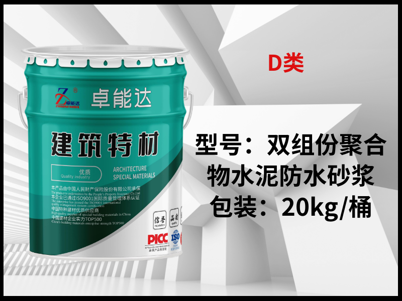 青岛卓能达青岛卓能达聚合物乳液水泥防水砂浆,双组份聚合物水泥防水砂浆是一种结合了聚合物乳液和水泥的新型防水材料,具有优异的防水性能、粘结性和耐久性。产品特点防水性能:聚合物乳液在水泥砂浆中形成连续的聚合物膜,有效阻止水分渗透,特别适用于长期浸泡在水中的环境,如水池和地下室粘结性:聚合物乳液增强了砂浆与各种基层材料(如混凝土、砖石、木材等)的粘结力,即使在基层表面不平整的情况下也能保证良好的粘结效果耐久性:聚合物乳液与水泥水化产物相互交织,形成复合结构,提高了砂浆的抗裂性能和耐腐蚀性,适用于各种恶劣环境环保性:聚合物乳液水泥防水砂浆属于无毒、无害、无污染的绿色环保产品应用场景地下室、外墙、水池、厨卫间、水塔及设备基础:这些地方需要长期防水防潮,聚合物乳液水泥防水砂浆能够满足这些需求屋面、游泳池、隧道、大坝渗流面:这些地方需要承受较大的水压和频繁的温度变化,聚合物乳液水泥防水砂浆具有良好的柔韧性和抗裂性,能够适应各种变形混凝土及钢筋混凝土建筑物的防渗处理:在混凝土建筑物的防渗处理中,聚合物乳液水泥防水砂浆能够填补孔隙,增强结构的致密性施工方法基层处理:基层表面应平整、粗糙、清洁,无油污、浮灰等杂质搅拌:在搅拌容器内倒入适量的乳液(用量为干粉重量的17-20%),然后再倒入聚合物水泥防水砂浆,搅拌至均匀无结块的胶浆即可进行施工施工:摊铺完毕后应立即压抹,并一次抹平,避免反复抹压。遇有气泡时应刺破压紧,表面应密实养护:施工后应进行喷雾养护或覆盖塑料薄膜,潮湿养护期间如遇寒流或下雨应加以覆盖,养护温度不得低于5°C...